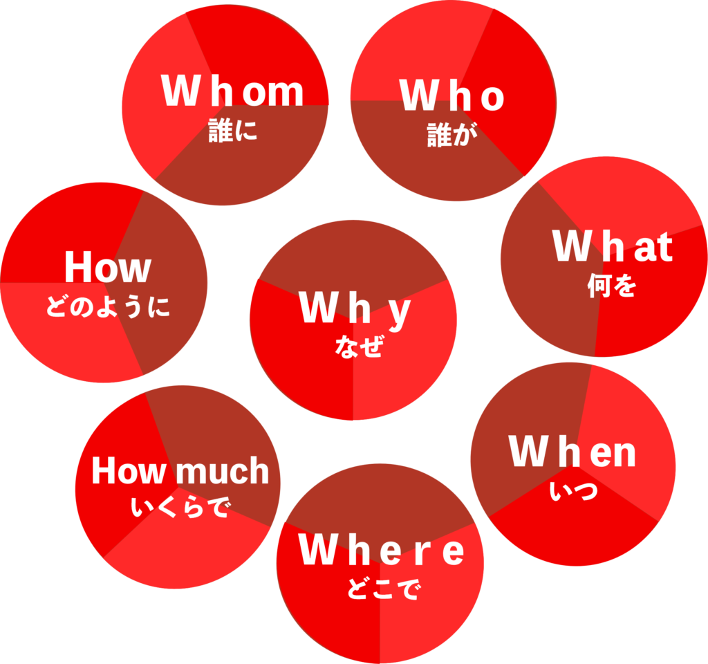 6W2Hとは、「なぜ(Why)」「誰に(Whom)」「何を(What)」「Who(誰が)」「いつ(When)」「どこで(Where)」「どのように(How)」「いくらで(How much)の7つの要素から成り立っています。