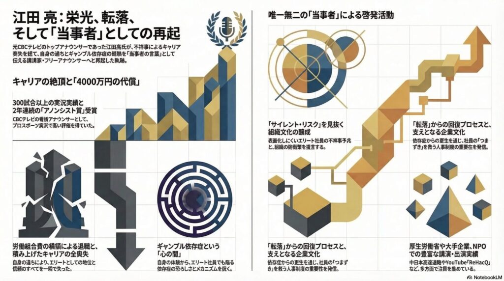【 】 江田 亮 <えだりょう> フリーアナウンサー 自らのエリート街道からの「転落」と「再生」という壮絶な実体験をベースに、組織の不祥事を未然に防ぐ「サ... -