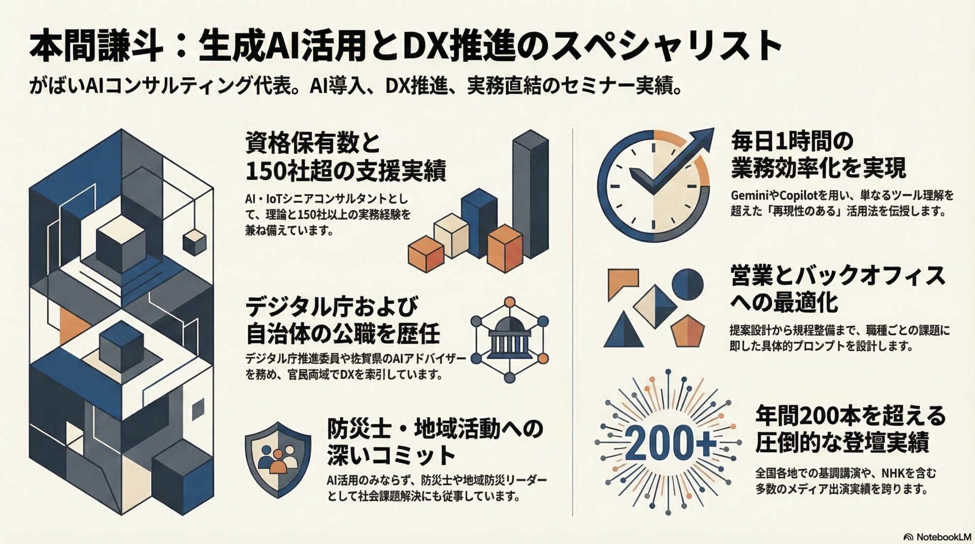 年間200本以上の登壇するAIの専門家。「毎日の業務を1時間効率化する」実践的な生成AI活用術を伝える。デジタル庁デジタル推進委員や佐賀県の生成AIアドバイザーなどの公職を多数務めるほか、防災士や野球独立リーグのアドバイザーとしても幅広く活動しており、多くのメディアで紹介されている。