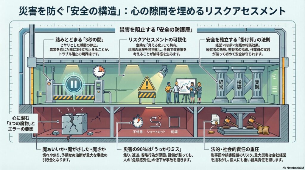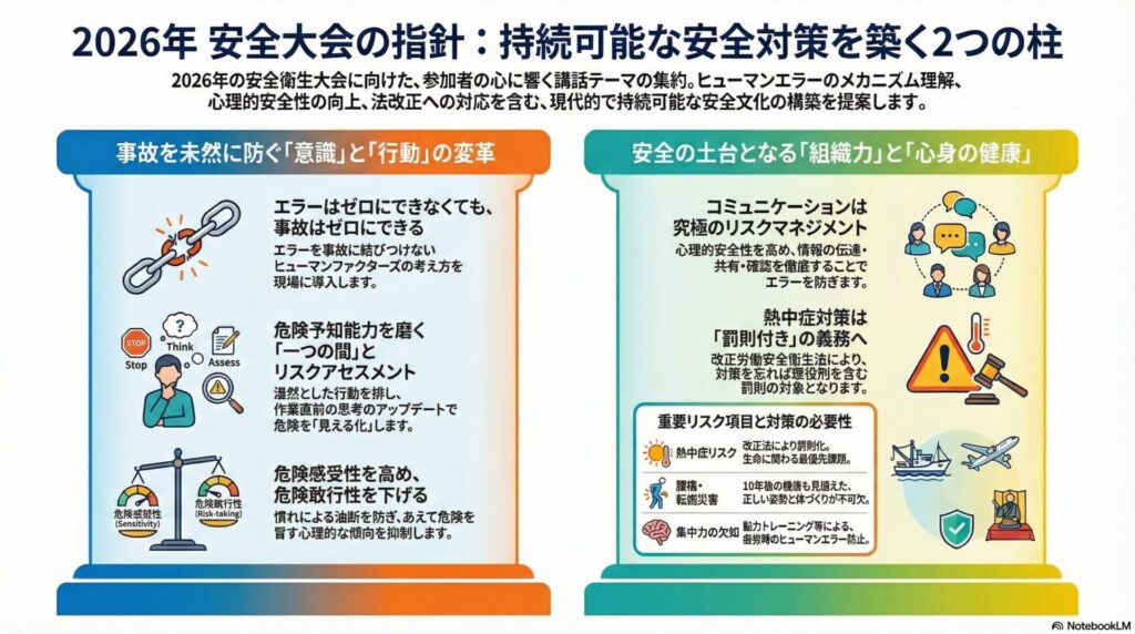 直接的な事故防止だけでなく、従業員の心身の健康が安全な職場を支える基盤であるという視点を強調します。