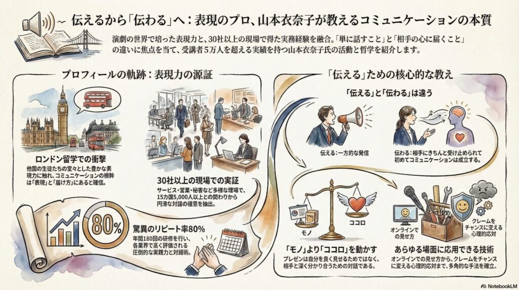 【伝える“伝わる表現”のプロフェッショナル】 山本衣奈子 <やまもとえなこ> 伝わる表現アドバイザー 演劇をきっかけに、社会経験から得たものを組み合わせ、「表現力」「分かりやすさ」「まとめる力」を伝える“伝わる表現”のプロフェッショナル。... -