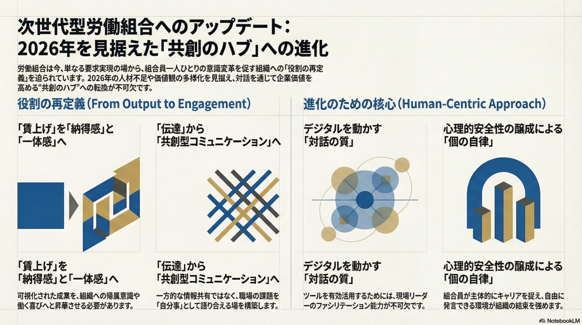 デジタルツールやデータの活用は強力な武器になりますが、それを動かすのは「対話の質」という人間力に他なりません。形式的な協議を、実質的な「未来の働き方の構想」へと転換するためには、現場のリーダーたちのファシリテーション能力や、心理的安全性を醸成する啓蒙活動が不可欠です。