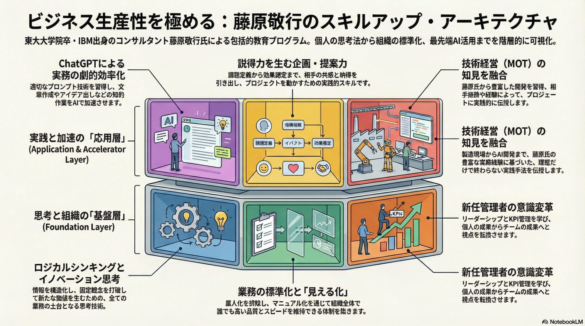 思考法からAIまで幅広いスキルを有するコンサルタントで、ビジネスの生産性を高める様々なフレームワークを伝授するマルチ講師。