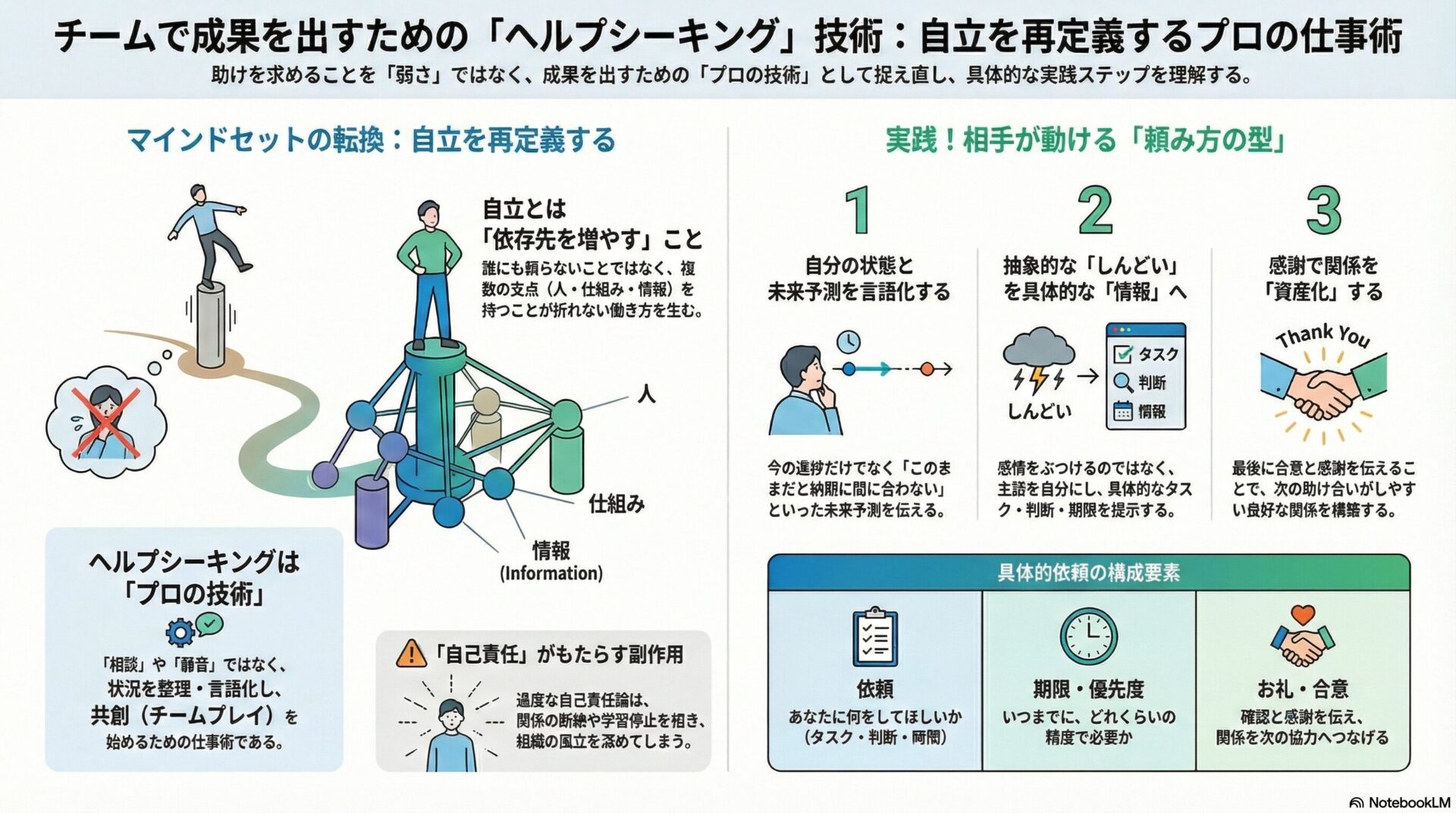 ヘルプシーキングとは何か・ヘルプシーキングとは相談の事ではない ・特性ではなくスキルである ・自立を再定義することとその背景ヘルプシーキングは“相談”ではない 「気づく→整理する→求める→活かす」の行動スキルであり、性格ではなく、再現できる技術である 依存の種類(人・仕組み・情報・外部資源)と、偏りのリスクを知る。1支点から「複数支点」へ(折れない働き方の構造)