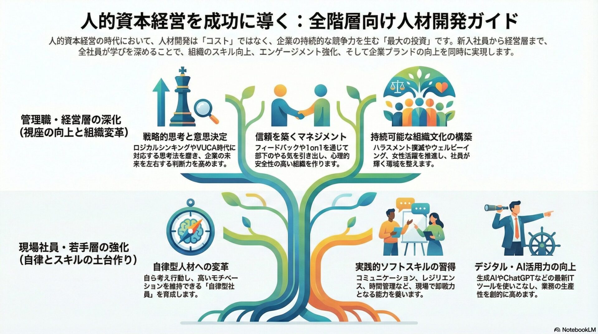 人材開発への投資は、新入社員から若手、中堅、そして管理職・経営層に至るまで、全階層で不可欠です。各層が学びを深めることで、組織全体のスキルと意識が向上し、相乗効果で企業は大きく成長します。この全社的な底上げこそが、持続的な競争力の源泉となります。