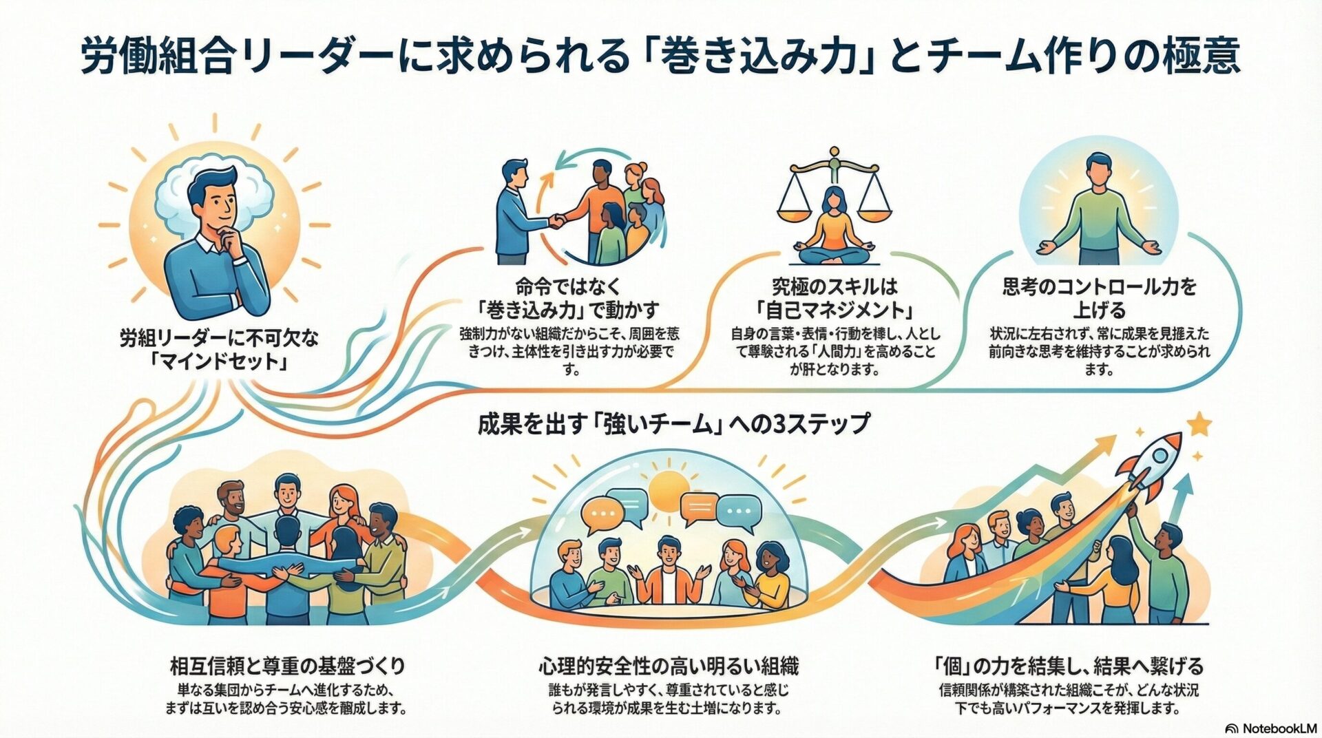 様々な人が集う組織では、どんな状況であれ成果を出すこと、結果を出せる力が求められます。特に労働組合は、会社と違い強制力ではない巻き込み力が一層求められます。