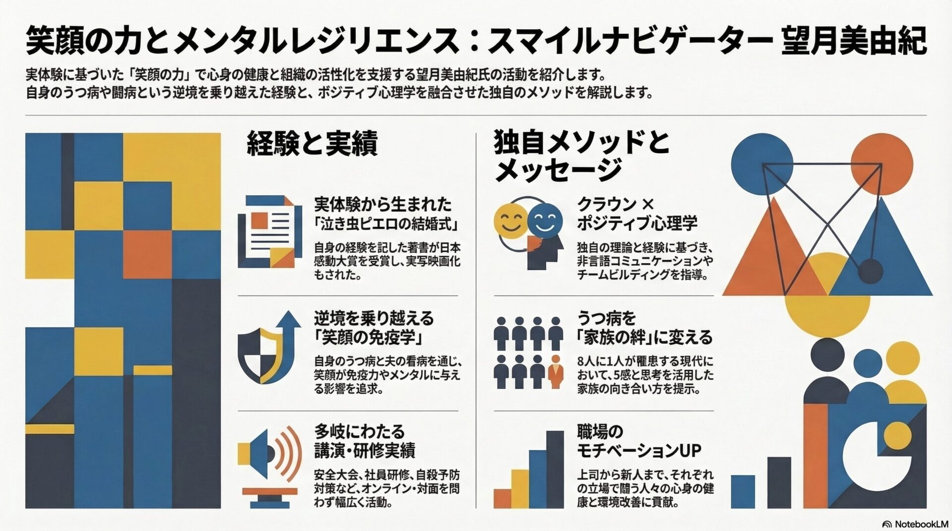 自身の経験を記した書籍「泣き虫ピエロの結婚式」が映画化(主演:志田未来・竜星涼)したクラウン。自身のうつ病をきっかけに免疫学を学び、夫の闘病と死も笑顔の力で乗り切った体験をもとに、講演活動を始める。