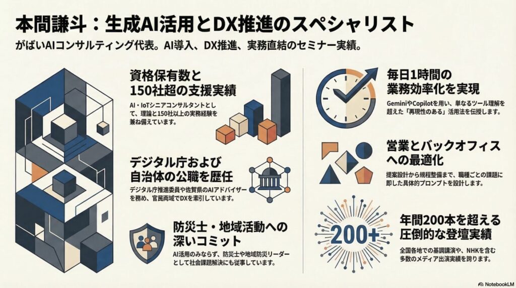 【生成AIを活用したDX推進術】 本間 謙斗 がばいAIコンサルティング株式会社 年間200本以上の登壇するAIの専門家。「毎日の業務を1時間効率化する」実践的な生成AI活用術を伝える。デジタル庁デジタル推進委員や佐賀県の生成AIアドバイザーなどの公職... -